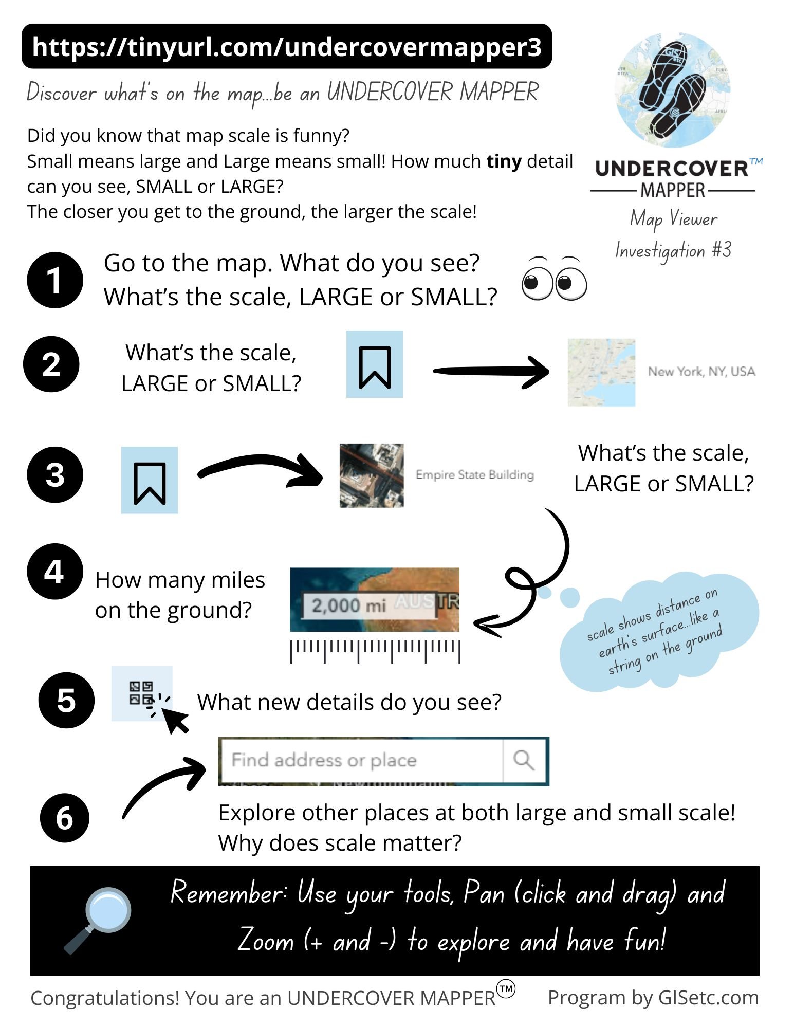 With both of those factors in mind, Undercover Mapping #1 was developed to take the learner on an informal and fun tour of the tools needed to complete the Elementary GeoInquiries. These activities were tested by elementary teachers and their students and they were a resounding success. After some tweaks and minor revisions, Undercover Mapper #2 came along to take students on another adventure while gently ramping up the tool difficulty. We are expanding the collection to explore specific topics. The first is SCALE. Each activity ends with a fascinating “scavenger hunt” of amazing and fun features on the Earth.